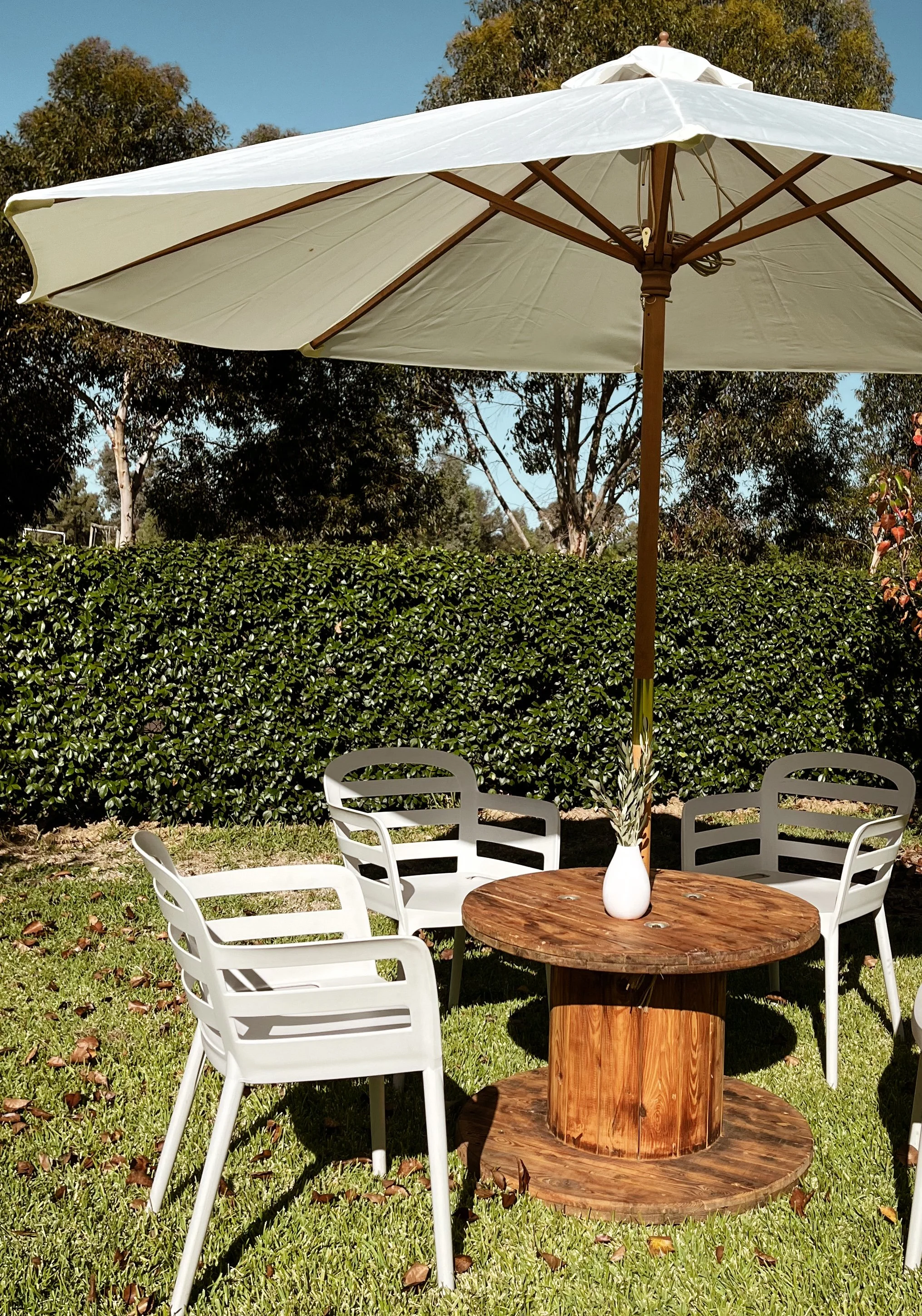 Provides stylish shade with bases included in hire. Alternatively, pair with our Timber Cable Drums (hired separately) by placing the umbrella in the centre hole for a cohesive look.